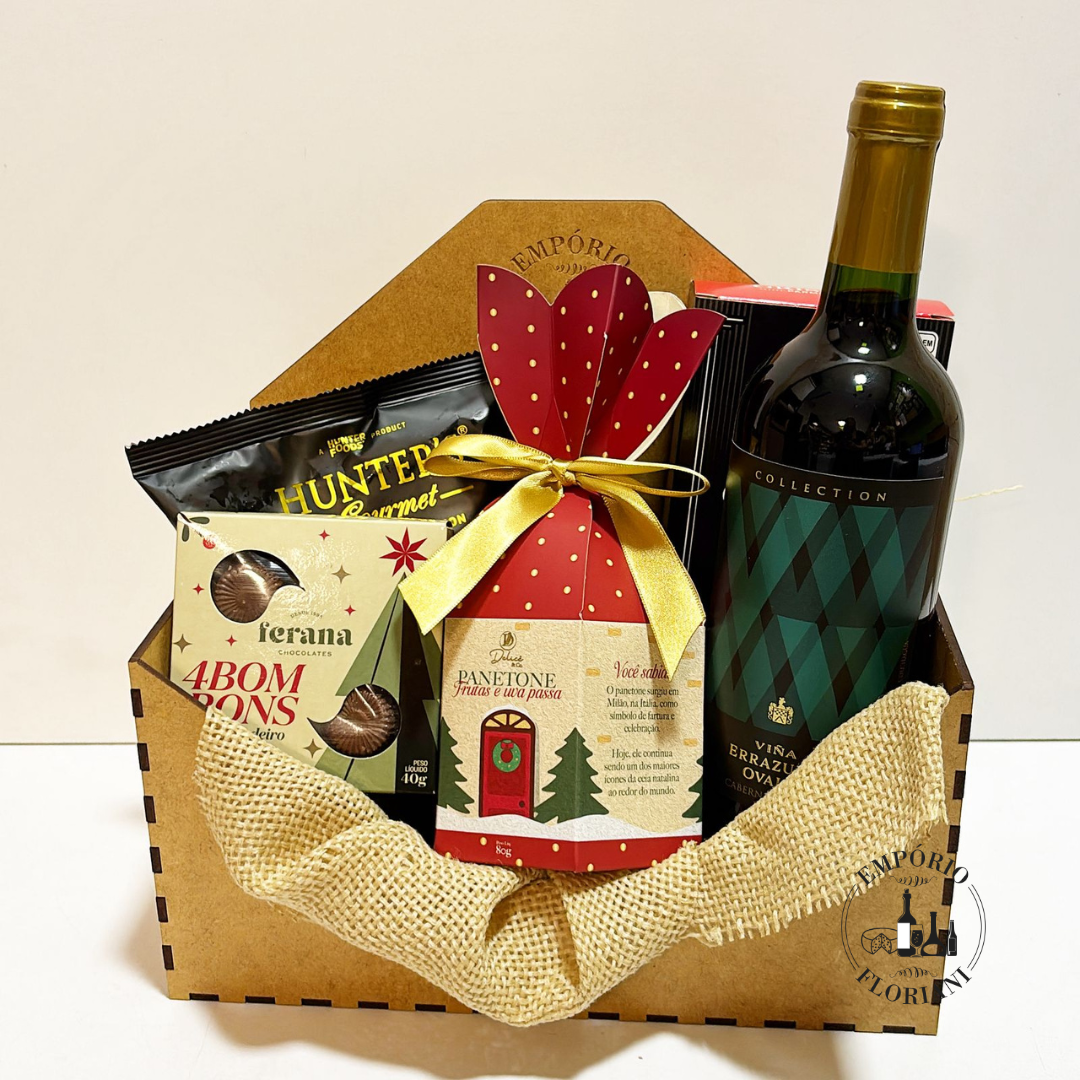 Contém: vinho tinto fino 750ml, panetone ou chocotone 80gr, caixa bombons chocolate, grissini, batata chips