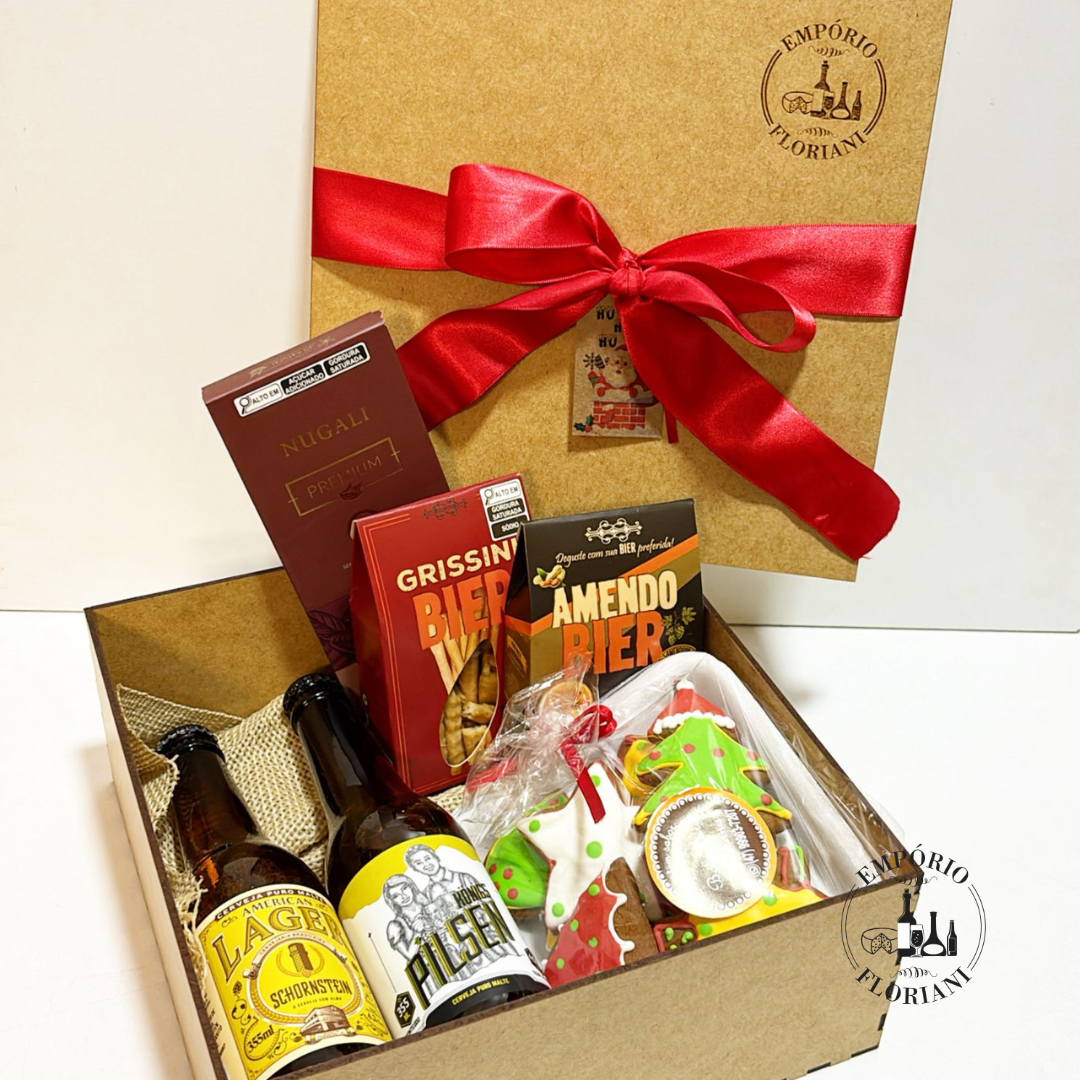 Contem: 2 cervejas artesanais 355ml, bolachas decoradas Natal, barra chocolate Nugali, grissini, amendoim salgado