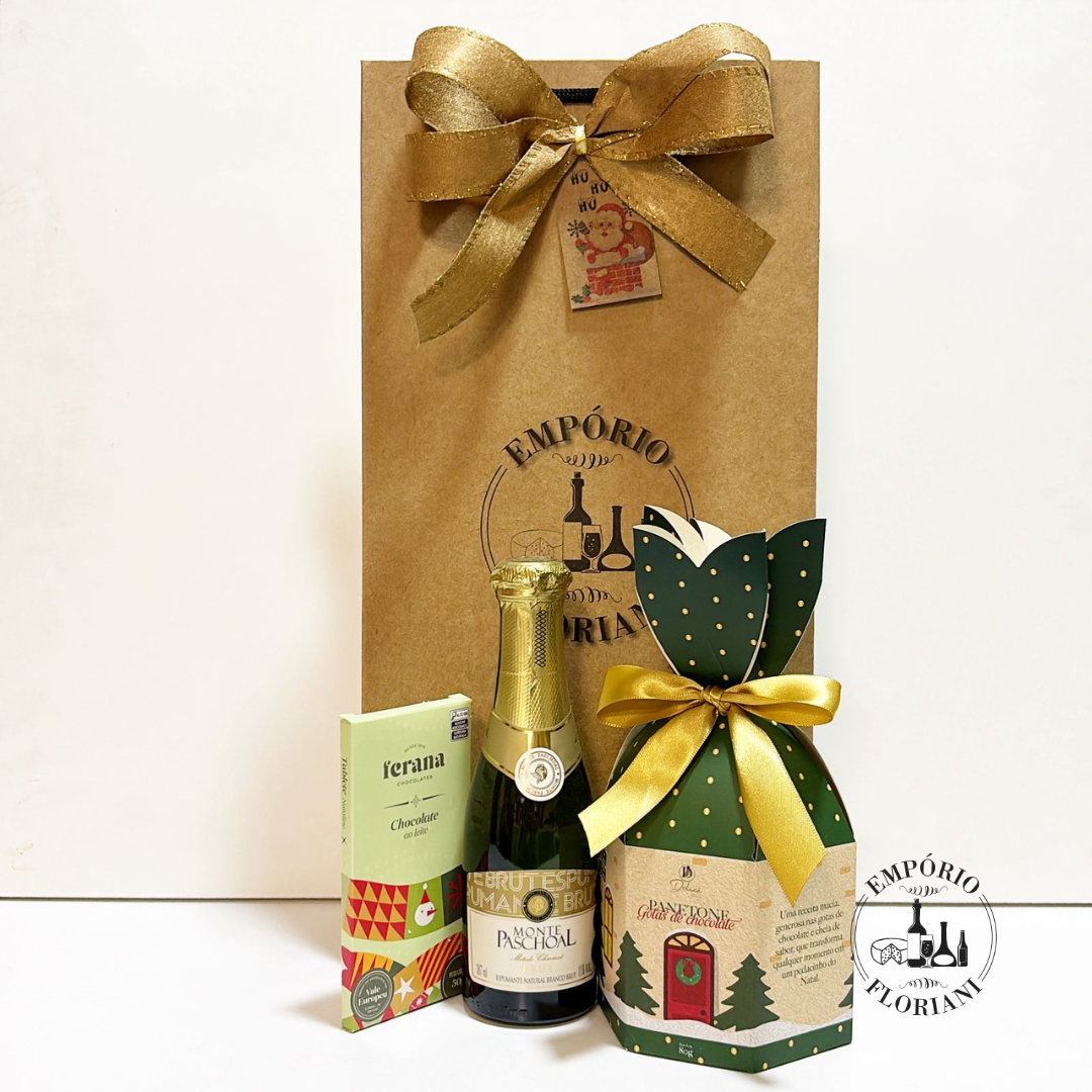 Contem: panetone ou chocotone artesanal 80gr, espumante brut ou moscatel 187ml, barra chocolate ao leite