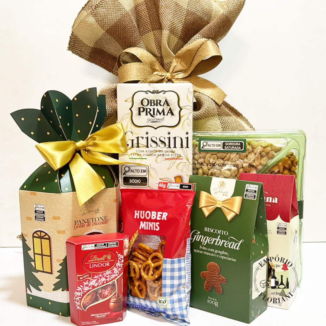 Contem: panetone ou chocotone 250gr, caixa bombons importados, grissini, bandeja mix amendoim, biscoito gingerbread, drageas de chocolate, salgadinho mini bre